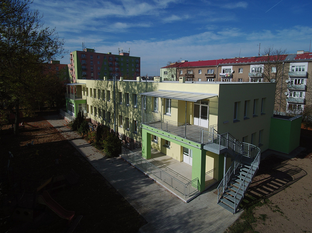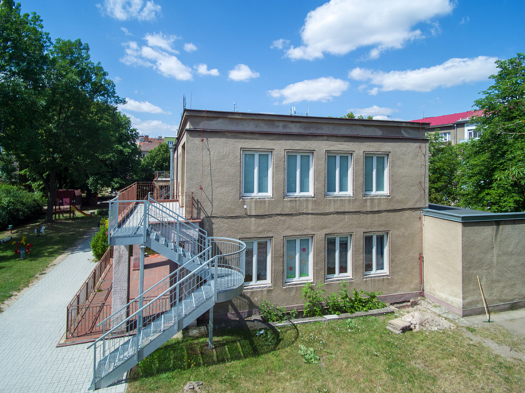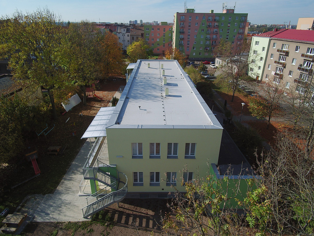Zateplení fasády a střešního pláště budovy 51. mateřské školy v Plzni, ulice Částkova. Sanace suterénu. Realizace 2019.