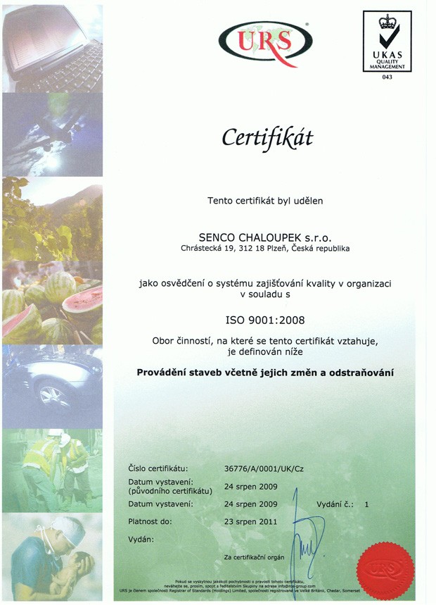 Jsme držiteli Certifikátu ISO 9001 : 2001 a Certifikátu ISO 14001 : 2005